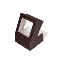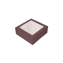 Cajas Pastelería Con Ventana Chocolate 32 x 32 x 10 cm. Cajas de pastelería fabricadas en cartón nano - micro ondulado con 250 g/m². Con ventana OPP fácil de quitar con alta visibilidad. Apertura frontal que permite introducir y retirar los postres con facilidad. Muy resistentes y ligeras. Biodegradables y reciclable. Aguanta temperaturas de -18ºC hasta +70ºC. Dimensiones: 32 x 32 x 10 cm.